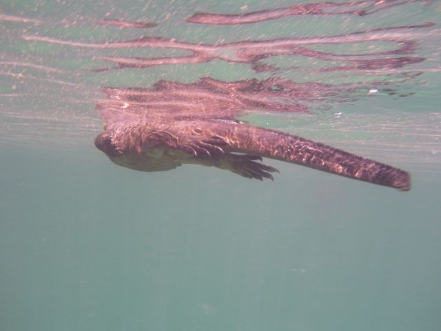 | Meeresechse beim Schwimmen über der Wasserlinie aus gesehen | Meeresechse beim Schwimmen unter der Wasserlinie aus gesehen |