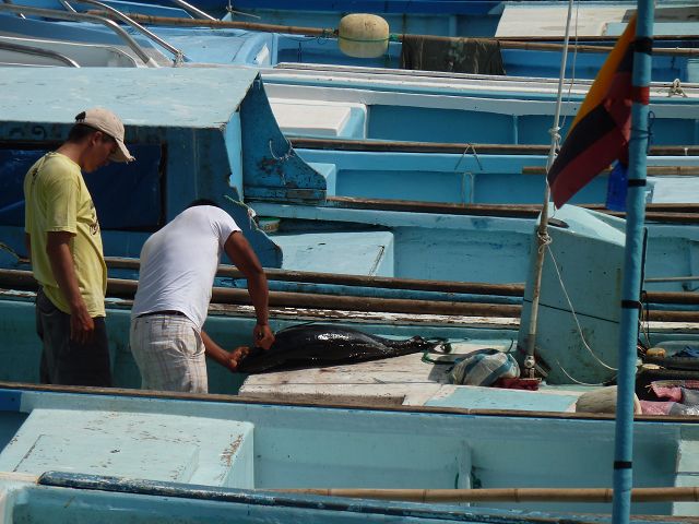 Fischmarkt in Puerto Ayora reste für die Pelikane