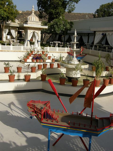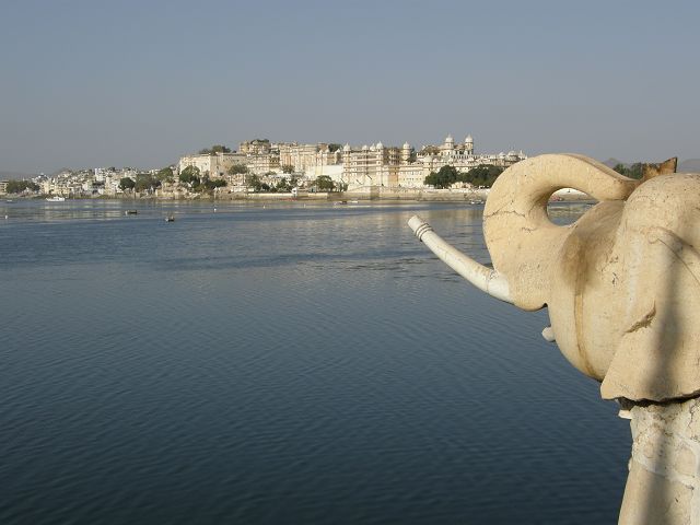 Bootsfahrt zur Lustinsel Jag MandirDie Runde entlang des Ufers unterhalb des Stadtpalastes ist nett und vermittelt uns, warum Udaipur auch Venedig des Ostens genannt wird. Wir sehen Tempel unter Bäumen dicht am Wasser, Pavillons und so etwas wie das Strandbad. Hier plantschen die einheimischen Jungs und waschen die Frauen. Ziel, die Lustinsel Jag Mandir. Das Eiland ist äußerst winzig. Springbrunnen und ein paar Gärten mit Rosen. Aber es gibt oberhalb des Lokals eine Balustrade mit hübscher Aussicht auf das Ufer und auf die großen, weißen Marmorelefanten, die die Anlegestelle bewachen