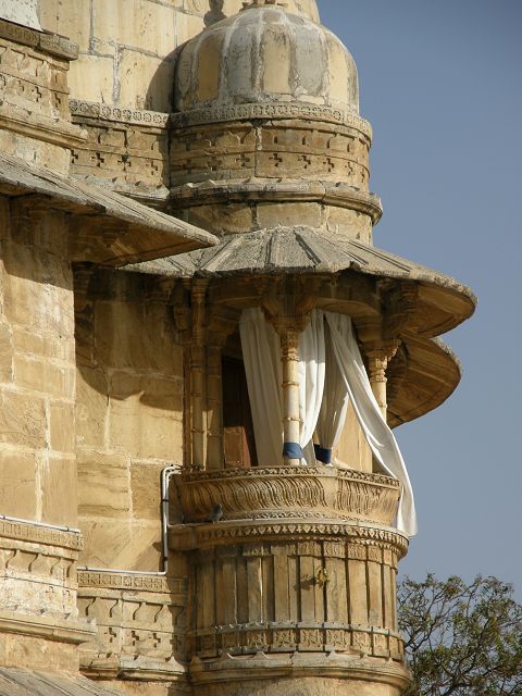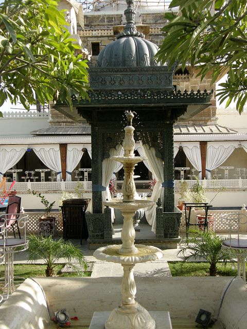 europäische Frauen und Kinder. Die Kuppel des dem Stadtpalast zugewandten Hauptgebäudes ist mit detailreichen Steinintarsien verziert. Im Zentrum des Gartens vor dem Gebäude, der von Steinelefanten bewacht wird, steht ein chhatri aus grünen Marmor, dessen Verzierungen Weinreben und Blumen zeigen. Abgesehen von den Vogelscharen sind die einzigen Bewohner des Jag Mandir drei Diener, die mit der Pflege der Gartenanlagen und Aufzucht der Blumen für die Feiern des Maharana betraut sind. |