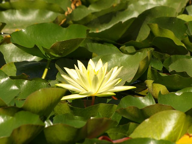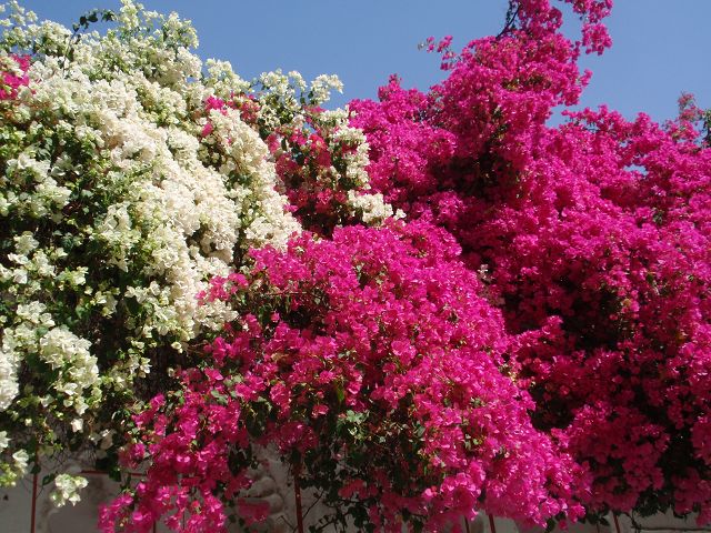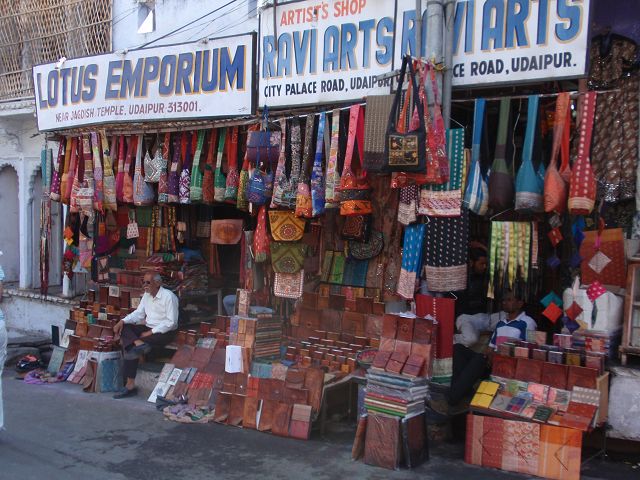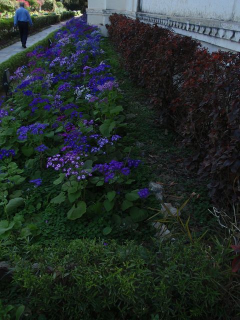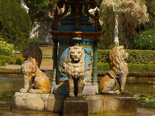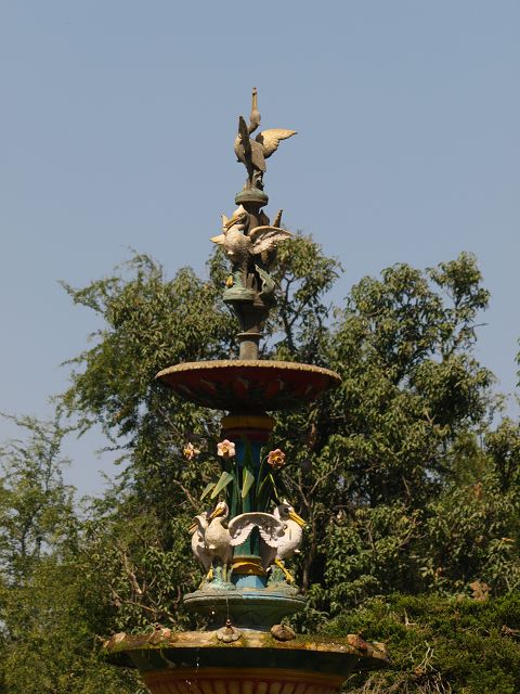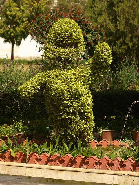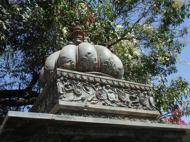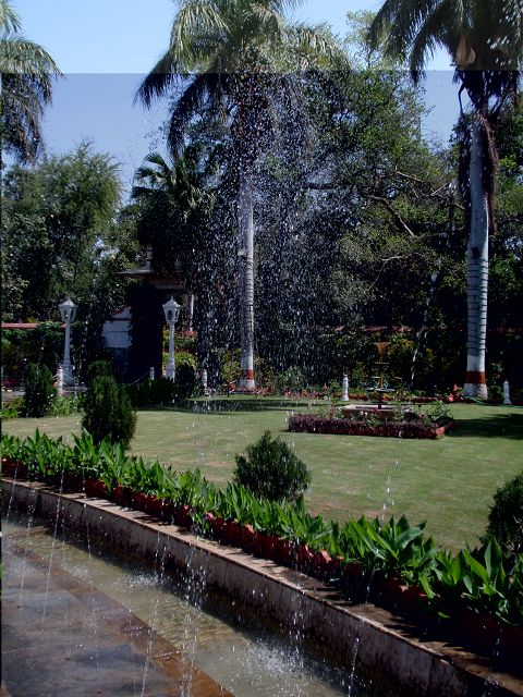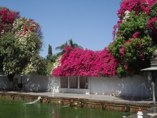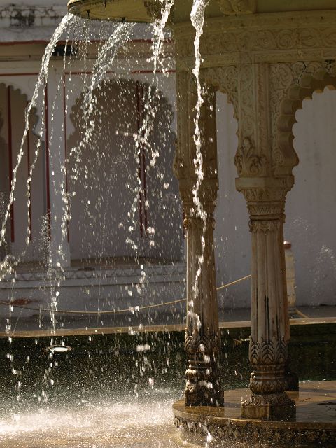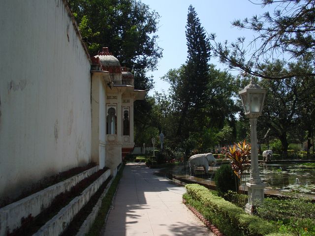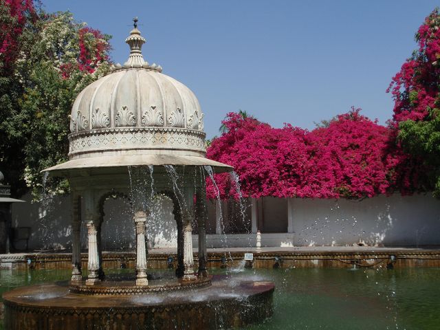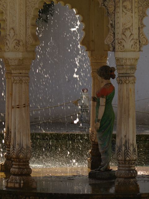 Sahelion-Ki-Bari Bagh Garten + Swimmingpool für die PrinzessinenDie goldenen Maske des Sonnengottes Surya dominiert wird. Die Herrscherdynastie von Udaipur behauptet von ihm abzustammen.Schließlich bedeutet der Name Udai auch Sonnenaufgang. Unterhalb des Sonnengesichtes sind viele detailreiche Reliefs mit paradiesischen Szenen zu bewundern. Mann tritt durch ein weiteres Tor und findet ein großes Becken aus weißem Marmor vor. Es ist umgeben von hohen Mauern, um die Prinzessin und ihre Hofdamen beim Baden einst vor neugierigen Blicken zu schützen. Bougainvillea und gelbe Trompetenblumen ranken sich über die Mauern und an den Türmchen aus schwarzem Marmor. In der Mitte des Pools dreht sich ein steinerner Vogel über einer schmiedeeiserne Mädchenstatute, die auf das bunteste bemalt ist und ziert einen kleinen Springbrunnen. Die Wassertropfen glitzern und funkeln in der Sonne, bevor sie auf den Grund des Beckens niederfallen. Rund um den abgeschirmten Swimmingpool ist ein kleiner Park angelegt. In einer Ecke befindet sich ein so genannter Monsunbrunnen. Hier plätschert unaufhörlich Wasser auf die großen Blätter von Fächerpalmen und erzeugt so den Eindruck, als würde gerade sanfter Monsunregen fallen. Etwas weiter hinten im Park finden wir einen großer Brunnen mit 4 Marmorelefanten. Seine Oberfläche ist über und über mit rosa Lotosblumen bedeckt, die ihre geöffneten Blüten der Sonne entgegenhalten. Gegen 10 Rupies dreht eine Frau das Wasser auf, so daß wir die Fontänen in all ihrer Pracht bewundern können. |
