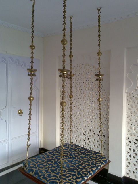 elegance. An antique swing, suspended by decorative gleaming brass chains,