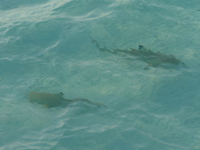 | Ankunftsterminal | mit Weißspitzenhaien unter dem Steg |