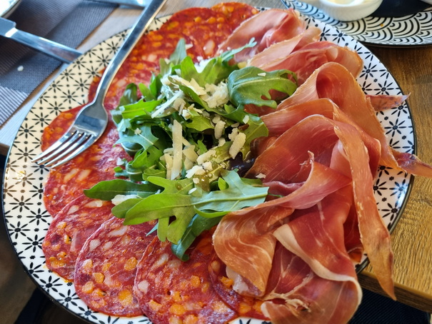 | Kais restaurant Schloss Homburg Finger Food: Roastbeef mit Rucola, Chorizo, Oliven, italienisches Gemüse mit Knoblauch, Scampi auf Staudensellerie, Bruschetta mit Tomaten und Basilikum, Bärlauch-Aioli mit Radieschen / | Kais restaurant Schloss Homburg Vorspeisen-Etagere |
