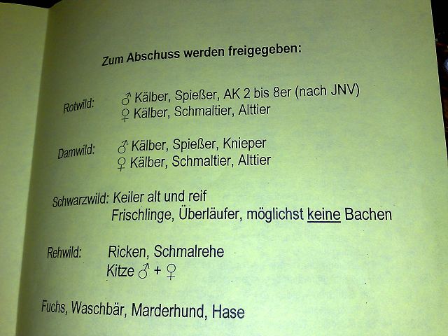 Es kommen alle Hauptwildarten wie Rotwild, Rehwild, Schwarzwild und Damwild vor.