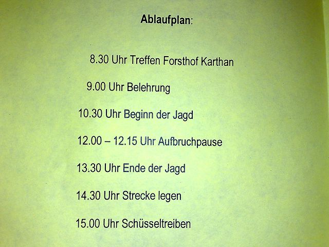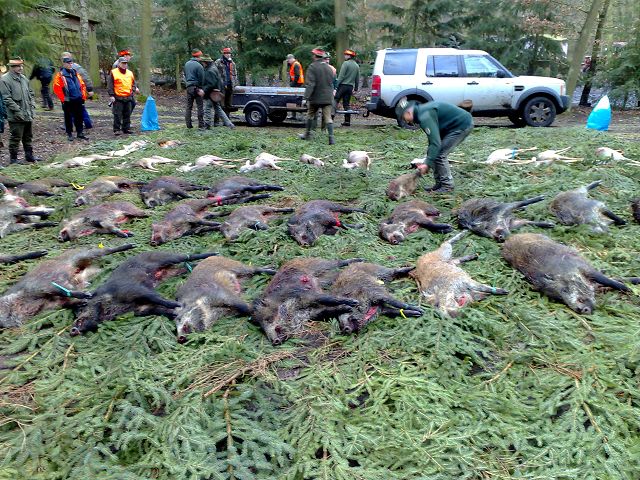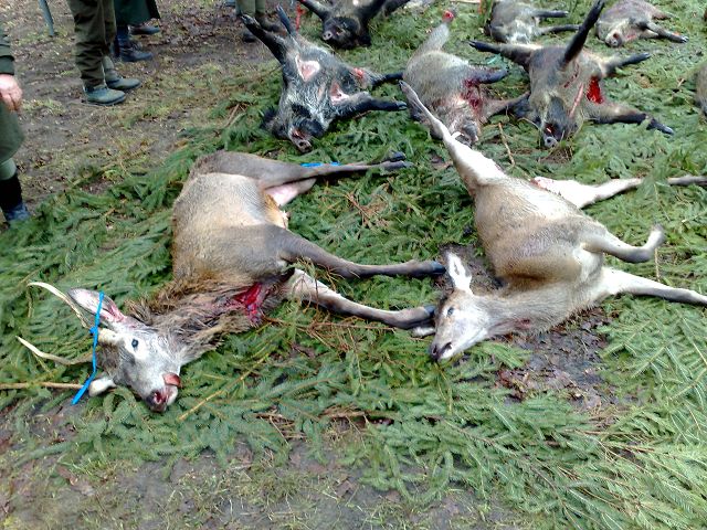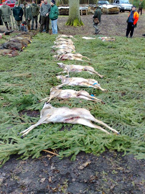 Gesamtstrecke in Karthan  2 Rothirsche 30 Sauen 10 Rehe 2 Füchse 1 Hase  Strecke hängen
