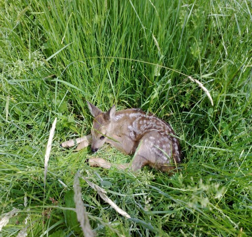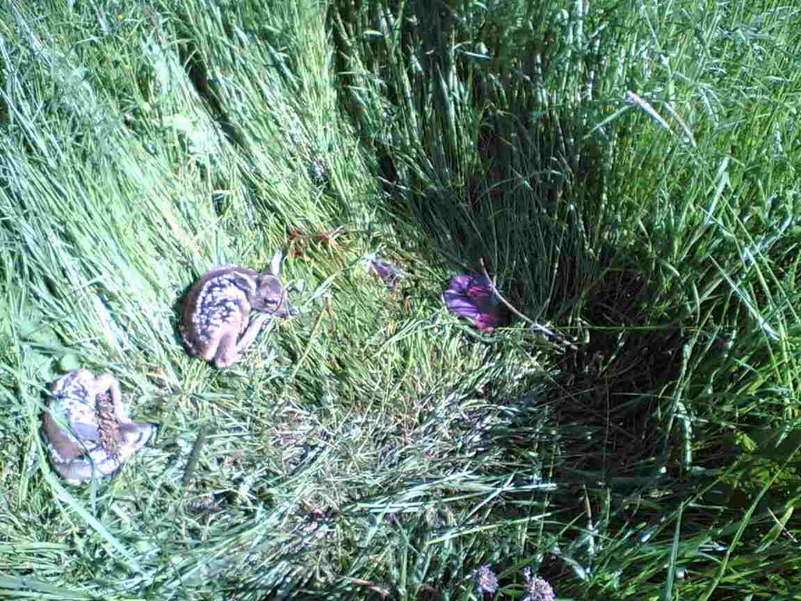 Die beiden Kitze wurden kurz vorher gesetzt , die Placenta lag noch daneben im Gras und die Ricke hatte aus dem Spiegel ein Stück Nabelschnur anhängend. Rehkitze suchen im Gras | |