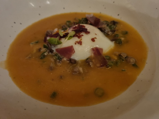 Hotel Es Port Restaurant Sa Figuera Menu del Valentina Dia  Niedrig Temperatur Bio Ei Iberischer sschinken gemüse Pilze der Saison Pancuit Creme Knoblauchsuppe Hotel Es Port Restaurant Sa Figuera Canneloni mit Ente Und Foie demit Suace Dolc des Port