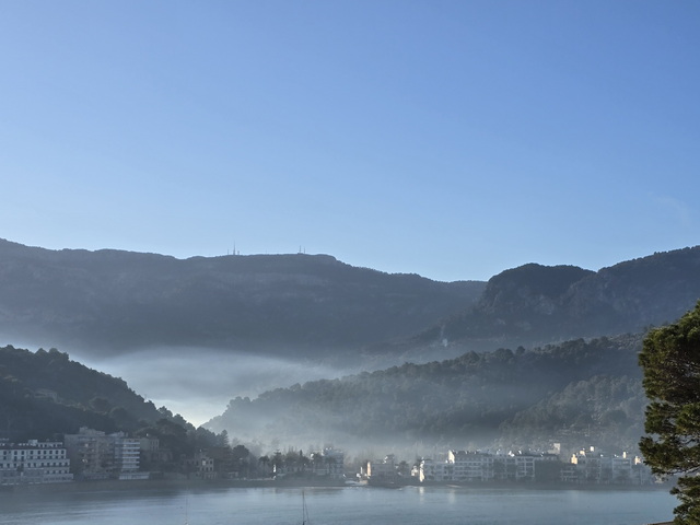 beleuchtete Bergkette des Tranontana Morgennebel im Hafen