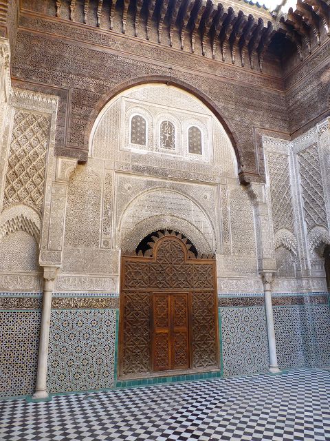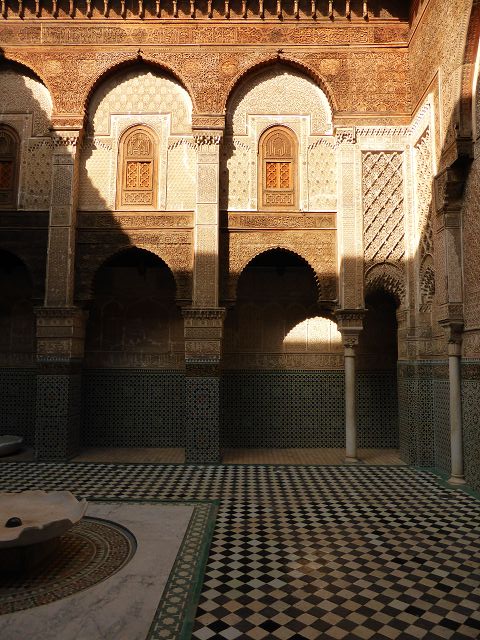 Ich bin der Sammelpunkt aller Wissenschaften. Mache aus mir dein Heim und du wirst, wie du hoffst, ein einzigartiger Wissenschaftler werden", dies ist eine der typischen Inschriften, die man auf den Kacheln der Bou Inania-Medersa findet. Sie wurde von dem merinidischen Sultan Abou Inane in den Jahren 1350 bis 1357 erbaut. Sie ist sowohl eine Koranschule als auch eine Große Moschee mit einem hohen Minarett und einer bemerkenswerten Kanzel. Im gesamten Gebäude ist der Eindruck der Perfektion wahrzunehmen. Die Feinheit und Vielfalt der Farbtöne, die den weissen, rosaroten und hellblauen Marmor mit den grünen und schwarzen Kacheln vereinigen, verleihen dem Ganzen eine unvergleichliche Harmonie. Auf Regalen aus bearbeitetem Zedernholz sind die Bronzeteile eines ehemaligen Carillons zu sehen.