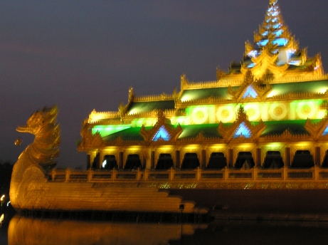 Bootrestaurant Karaweik auf dem Kandawgyi Lake oder Royal Lake , Die Doppelboote sind als Hinthavogel gebaut ,