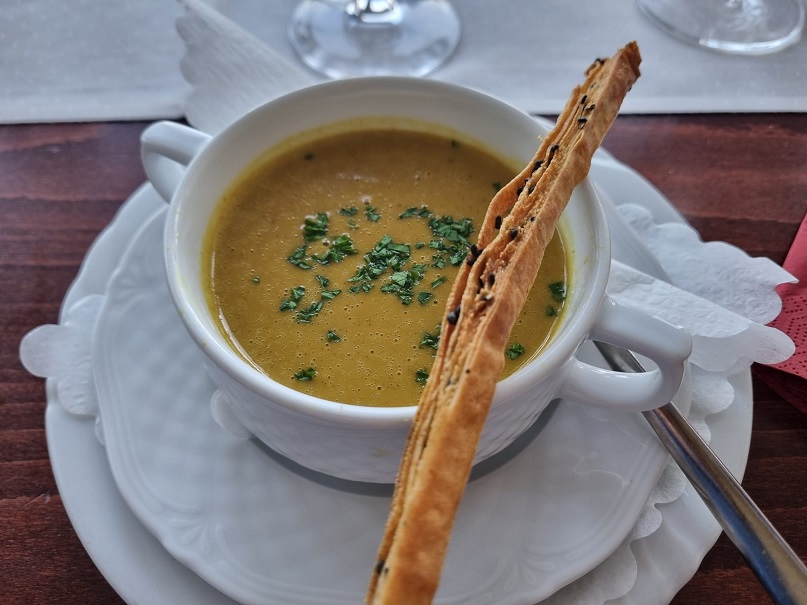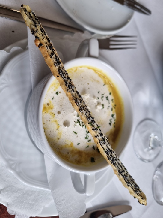 | Kokosmilch-Currysuppe mit Sesamstange | Attenbacher Köppchen Passionsfrüchte-Soufflé mit Kaffeeeiscreme |