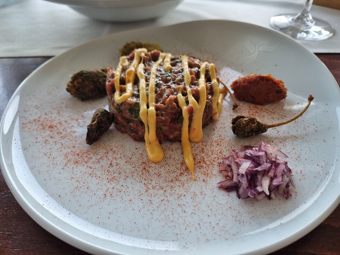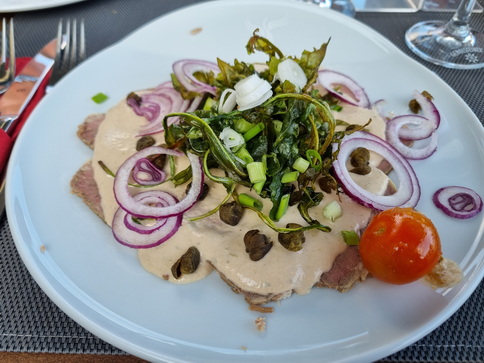 | Tatar vom Holsteiner Rinderfilet angemacht, Aioli crème, Tomaten, Haus-Baguette, Butter | Weißwein-Marsala-Sabayone mit hausgemachter Joghurteiscreme |