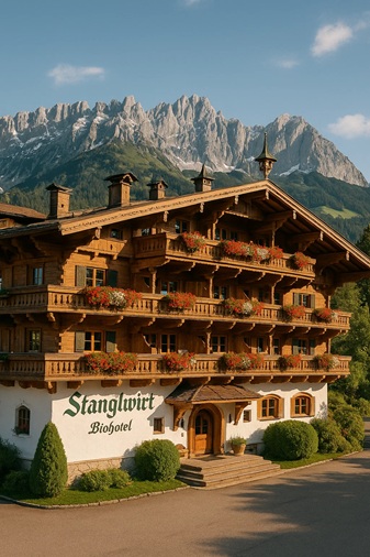 Gasthof „Stanglwirt“ (innere „Stangl“) mit sehr traditioneller, rustikaler Tiroler Atmosphäre und Menü mit regionalen Bio-Zutaten. Wilder Kaiser Ein Großteil der Milch- und Fleischprodukte stammt vom hauseigenen Bio-Bauernhof.