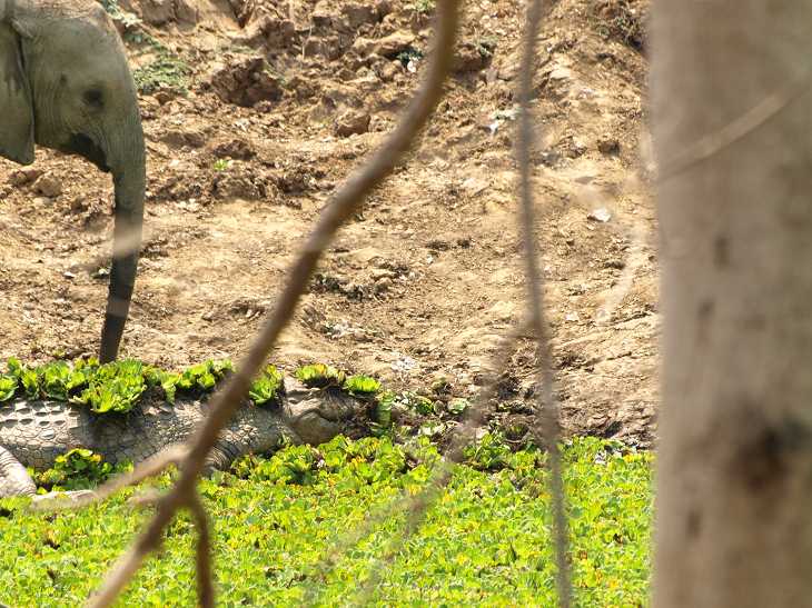 | die unheimliche Begegnung passiert am Nsefu Lodge Wasserloch | ein junger Elefant trinkt am Wasserloch und kommt einem gut getarntem Croc näher |
