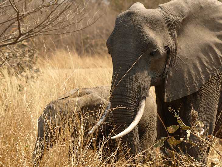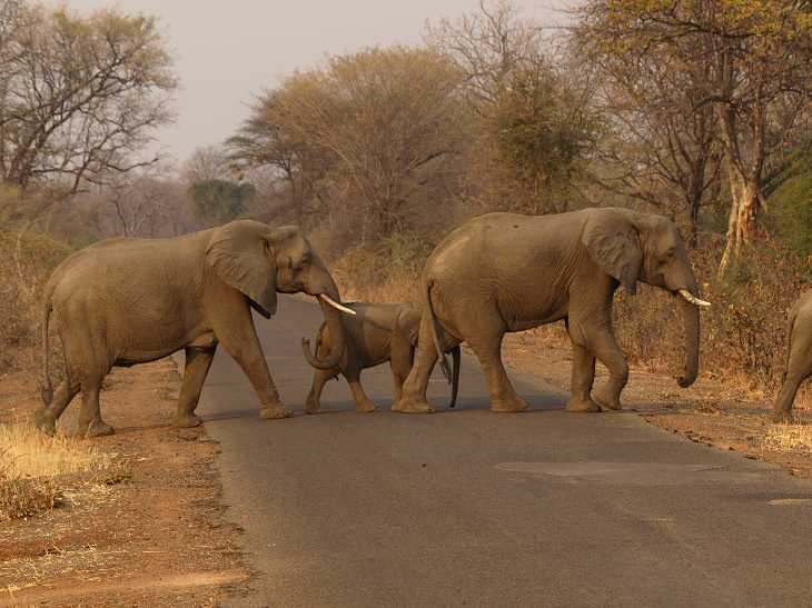 | Die Elefanten kommen aus dem N.P. und gehen mal gucken was in den Gärten des Orte Mfue wächst | die stören sich gar nicht an den Menschen |