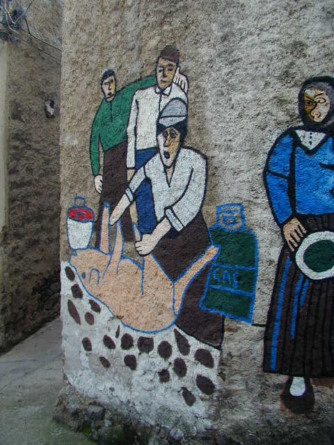 leprechon Schweineschlachen lekka essen Murales Wandgemälde in Orgosolo Sardinien Wallpictures Orgosolo Sardinia