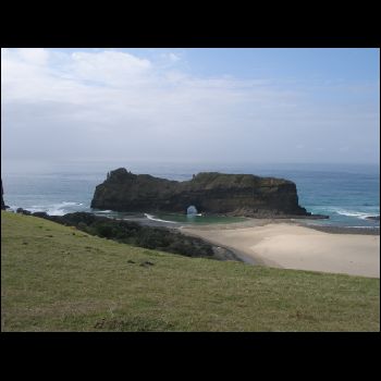 the sea has carved a large hole through a cliff, creating a dramatic and