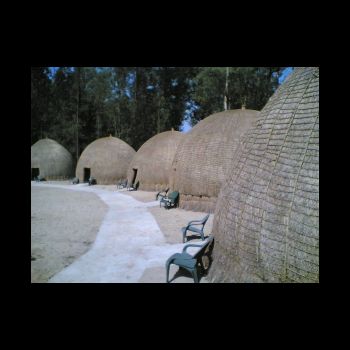 | Mlilwane Beehuts Von aussen wie eine Bienenkorb für Riesen 12 Häuschen im Kreis , in der Mitte Grillplatz Braai | Mlilwane Beehuts Bienenkorbhotelbetten |