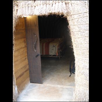 | Mlilwane Beehuts Bienenkorb hotel | Mlilwane Beehuts Bienenkorbhotel Innen glatter Boden ein Doppelbett und Kleiderschrank und der Durchgang zum gemauerten Badezimmer |