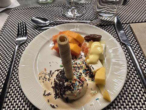 | Restarant El Drago im Hotel kuchen + Eis + Früchte | Restarant El Drago im Hotel Nachtisch Dulcetarta |